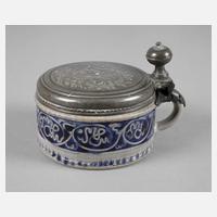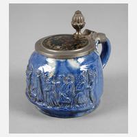 Mitte 19. Jh., ungemarkt, gelblicher Scherben, blau verlaufende Glasur, Figurenfries als Umzug mit Bewaffneten, Musikanten und Bürgern, zinngefasster Deckel mit Drücker in Form einer Blüte, dieser mit Liebespaar und Rollwerk bemalt, geringe Altersschäden, H 13 cm.