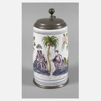 um 1750, rötlicher Scherben, handabgedreht, auf weißlicher Glasur mit Scharffeuerfarben bemalt, Motiv eines Herrn mit seinem Hund und Diener unter Palmen, übergreifender Zinndeckel mit kleiner Kugelrast, kleiner Einriss am Gelenk, Abplatzer am Lippenrand, brandrissig und etwas Alterscraquelé, H 13,5 cm.