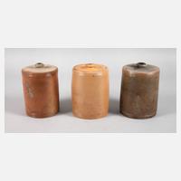 17./18. Jh., graues Steinzeug handabgedreht, braun glasiert, Walzenform mit kleiner gewölbter Verschlusstülle, schräg gekämmt mit Rillendekor an der Schulter, variierende Farbtöne, insgesamt etwas rissig, H je ca. 21 cm.