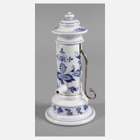 Lingner & Kraft Dresden, um 1900, Stempelmarke mit Patentangabe und Prägebuchstabe A, weiß glasiertes Steingut mit kobaltblauer Unterglasurbemalung, Senfspender in Form eines Pumpenbrunnens mit originalen Einsätzen aus Metall bzw. Glas und intakter Mechanik, Arretierung fehlt, größerer Chip an der Mündung sowie Altersspuren, H 23 cm. Beigegeben ausgeschnittene Werbeanzeige der Firma bezüglich des Objekts.