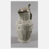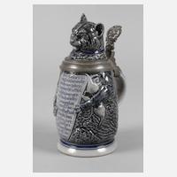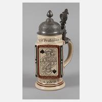 Reinhold Merkelbach Grenzhausen, um 1890, Prägemarke mit Schriftzug "geschützt", Modellnr. 686, cremefarbenes Feinsteinzeug, geritzt, reliefiert, bemalt und farblos glasiert, Zinndeckel mit Erinnerungsgravur, mit Spruch "Hab stets Glück und Frohsinn viel, Vier Wenzel auch in jedem Spiel", sehr guter Originalzustand, H 23 cm.