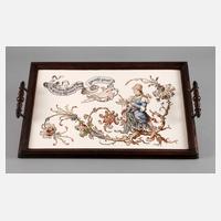 wohl Villeroy & Boch, um 1880, ungemarkt, gepinselte Modellnummer 2104, Steingut farbig bedruckt und farblos glasiert, Spruchband: "Was ihrem Mann zur Lust, ein minnig Weiblein braet, gar wohl geraet", dunkel gebeizte Weichholzfassung mit gedrechselten Griffen, guter altersgemäßer Zustand, L 50 cm.
