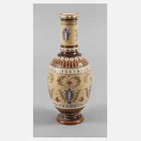 um 1890, Prägemarke V & B Mettlach, Modellnr. 1807, goldene Pinselmarke 23, hellgraues Feinsteinzeug, teilglasiert und bemalt, innen roséfarbene Glasur, verziert mit Ornamentbändern und stilisierten Blattmotiven, sehr guter Zustand, H 27 cm.