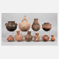 eine Flasche mit figürlicher Applikation, eine dergleichen mit zoomorphem Gesicht, drei Flaschen mit kürbisförmigem Unterteil, eine Kugelbauchflasche mit Reliefdarstellung eines Chamäleons und henkelförmigem Hals (H ca. 24 cm), ein Kugeltopf mit anthropomorpher Applike, ein weiterer dunkelbrauner größerer mit Doppelösengriffen (H ca. 15 cm) sowie zwei weitere kleine Vasen, davon eine mit rotem Überzug und Gesicht am Hals, Alters-, Klebe- und Sammelspuren.