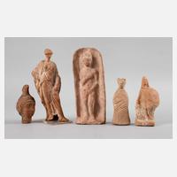 5 Stück, dabei eine Tanagra-Figur, ein Minerva-Kopf, eine schildtragende Figur, bei der noch die weiße Grundierung der Bemalung zu erkennen ist, eine dergleichen sowie wenigstens ein Antikenpasticco in Gestalt eines Venusreliefs, bei dem wesentliche Teile ergänzt sind, Sammelspuren, teilweise geklebt, die Echtheit kann in jedem Fall nur über eine Thermolumineszenzanalyse geklärt werden.