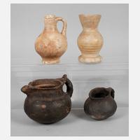 rheinischer Steinzeugbecher mit Wellenfuß, eiförmigem Körper und hoher Trichtermündung aus dem 15. Jh., H ca. 12,5 cm. - Kleiner salzglasierter Steinzeugkrug aus dem 15. Jh. (rheinisch) mit einfach abgezogener Standplatte, einhenkelig, H ca. 12 cm. - Zwei kleine Kugelbodentöpfe mit Henkel, undatiert, H ca. 7 und 10 cm; jeweils altersgemäße Erhaltung.
