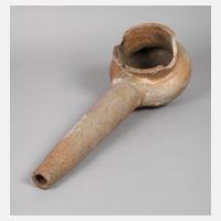 Mittelalter/frühe Neuzeit, sogenannter Destillierhelm, Steingut, offenes Kuppelgefäß mit langem, seitlich nach unten führendem Rohr, größere Ausbrüche, L 58 cm.