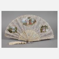 Anfang 20. Jh., undeutlich signiert S. Biarel G.?, Gestänge aus Perlmutt, aufwendig verziert von reliefierten Rokokoszenen, Seidenbespannung mit Spitzenbesatz, verziert von fein gemalten Watteau-Szenen in drei Kartuschen, abgehängte Quaste, leichte Gebrauchs- und Altersspuren, L 51 cm.