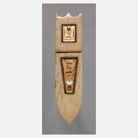 um 1820, ungemarkt, französisch dediziert A moi don d'amitié, Bein geschnitzt, eingelassene vergoldete Kartuschen mit zarten Perlmutteinlagen, Altersspuren, L 8 cm.