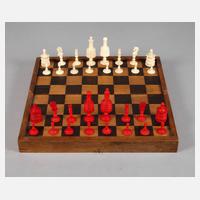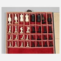 19. Jh., mehrteilig gearbeitet und montiert, teils gedrechselt und farbig gefasst, kompletter Satz Spielfiguren, min.best., Altersspuren, in Schatulle, welche zum Spielbrett umgewandelt werden kann, H König 8 cm, L Schatulle 31,5 cm.