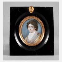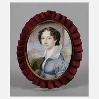 Anfang 19. Jh., unsigniert, Gouache auf Elfenbein, mit spitzem Pinsel trefflich erfasstes Portrait einer jungen Dame im Halbprofil, vor angedeuteter Architekturkulisse, im volantgesäumten Rahmen aus Pappmaché gefasst, Malgrund stärker gewellt, Maße 8,5 x 7 cm.