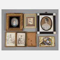 19./20. Jh., 5 Stück, dabei zwei Damenportraits Gouache auf Elfenbein, zwei Tuschzeichnungen, welches ein Rokokopaar in Landschaft zeigt, ein kolorierter Kupferstich sowie zwei def. Messingrähmchen, unterschiedliche Maße und Erhaltung, L max. 13 cm.
