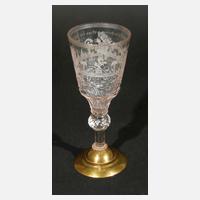Mitte 18. Jh., farbloses, leicht blasiges Glas, fein geschliffen, Balusterschaft mit Nodi, Rokokoelemente mit Rocaillen und Früchten, verschiedene Symbolik, Spruchbänder: "Durch beständig seyn und hoffen, wird zuletzt das Ziel getroffen, wie ein ungefälschter Wein, soll wahrhaffte Freundschaft seyn", "Wenn das Gelück einmahl vorbey, hilft kein Lauffen nach Geschrey", Fuß aus Messing und Metall ergänzt, ehemalige Vergoldung des Lippenrandes berieben, H 18 cm.
