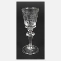 18. Jh., farbloses Glas mit Abriss, gewölbter Scheibenfuß mit nach unten umgeschlagenem Rand, hohl geblasener Schaft mit breitem Nodus, die glockenförmige Kuppa mit großer eingestochener Luftblase verziert, mattgeschliffenes Sachsenwappen, der Lippenrand mit umlaufendem Ornamentband, Glas etwas blasig und schlierig, unbeschädigter Zustand, H 15 cm.