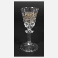 18. Jh., farbloses Glas mit Abriss, der leicht gewölbte Scheibenfuß mit nach unten umgeschlagenem Rand, hohl geblasener Schaft mit breitem Nodus, die glockenförmige Kuppa am Ansatz mit eingestochener Luftblase, mattgeschliffenes Sachsenwappen mit Kurhut, die Vergoldung etwas berieben, sonst unbeschädigt, H 14 cm.