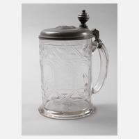 farbloses Glas, blasiger Abriss, leicht ausgestellter Stand, angesetzter Henkel mit eingerolltem Abschluss, übergreifender Zinndeckel mit Muscheldrücker und Besitzermonogramm "J.M.D.", schauseitig opake Emailmalerei, Engelsmotiv an einer Säule mit Herz, Spruchband: "Ein Hertze mus vor allen treu auf richtig und stand hafdig sein", seitlich umrahmt von Rocaillenmotiven und Blüten, bekrönt, sehr schöner altersgemäßer Zustand ohne Beschädigungen, H 16,5 cm.