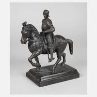19. Jh., gestempelt "Martin u. Piltzing Hofbildgiesser Berlin", Bronze grün patiniert, Nachbildung des bekannten Reiterstandbildes vor San Giovanni e Paolo in Venedig, dieses sollte den Condottiere Bartolomeo Colleoni ehren und prägte die Reiterstandbilder bis in das 19. Jh., Colleoni wird in prunkvoller Rüstung auf seinem geschmückten Hengst dargestellt, auf rechteckiger Bronzeplinthe, auf einen mehrteiligen Marmorsockel montiert, Sockel mit Rissen, ein Sporn verbogen, sonst gute altersgemäße Erhaltung, H Bronze ca. 31 cm, H gesamt ca. 48 cm.