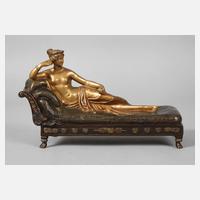 nach Antonio Canova, 19. Jh., unsigniert, Bronze polychrom in Kaltbemalung staffiert und vergoldet, Dargestellte ist Pauline Bonaparte, Schwester von Napoleon Bonaparte, später mit Camillo Borghese verheiratet, heute ausgestellt in der Galleria Borghese in Rom, zur Zeit der Erschaffung des Originals um 1805/08 erregte die Skulptur ungeheures Aufsehen, da höhergestellte Damen nie als Akt oder Halbakt dargestellt wurden und es brachen nach der Veröffentlichung der Skulptur große gesellschaftliche Spekulationen aus, ob sich Pauline Borghese tatsächlich nackt darstellen ließ oder ob nur der Kopf nach ihrem Abbild geschaffen wurde, die Dargestellte befeuerte wohl diese skandalösen Gerüchte sogar noch, sie wird lediglich von einem strategisch platzierten Tuch verhüllt, räkelt sich auf einer Chaiselongue und hält einen Apfel in der Hand und erinnert so an Aphrodites Sieg im Urteil des Paris, Chaiselongue mit vegetabilen Elementen und Muscheln verziert, partiell winzigst berieben, sonst sehr gut erhalten, H ca. 16,5 cm, L ca. 26,5 cm.