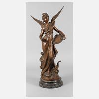 um 1900, signiert, recto Plakette mit Inschrift: "Mutualité Par Louis Moreau, Médaille d'Or" Bronze mittelbraun patiniert, Darstellung eines lorbeerbekränzten Engels mit Wappenkartusche, darauf Inschrift: "un pour tous, tous pour un", einen Fuß auf ein Füllhorn mit Früchten gestellt, auf getrepptem und gekehltem Marmorsockel, Stift fehlt, sonst gut erhalten, H Bronze ca. 61,5 cm, H gesamt ca. 66,5 cm. Künstlerinfo: französischer Bildhauer (1834 in Dijon bis 1917 in Malesherbes) Schüler von Mathurin Moreau, in Paris tätig, Quelle: Internet.