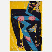 stehende Frau vor gelbem Grund mit Schlange, Farbserigraphie, um 1980, links unten signiert und nummeriert „Elvira Bach 16/50“, geringe Erhaltungsmängel, Blattmaße ca. 100 x 70 cm. Künstlerinfo: zeitgenösssiche dt. Künstlerin (geboren 1951 in Neuenhain im Taunus), 1967–1970 Staatliche Glasfachschule Hadamar, 1972–1979 Studium bei Hann Trier an der Hochschule der Künste Berlin, 1972–1981 Arbeit an der Schaubühne am Halleschen Ufer als Requisiteurin, Foyerdame und Souffleuse, 1982 Teilnahme an der documenta 7 in Kassel, 1997–2000 Arbeitsaufenthalte in St. Lucia Italien, 1998 Glasarbeiten in Murano, Quelle: Wikipedia und Internet.