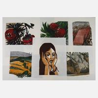 drei Blatt, enthält die Arbeiten „Blumen mit Ammonit“, „nächtliche Häuser“ und „Landschaft mit Bäumen“, Farbholzschnitte auf kräftigem Japanpapier, jeweils in Blei signiert, nummeriert und mit „Handabzug“ bezeichnet, ein Blatt leicht stockfleckig, je hinter Glas gerahmt, Darstellungsmaße max. ca. 30 x 40 cm. Künstlerinfo: dt. Holzschneider (1928 Tübingen bis 1986 Tübingen), 1945 Besuch der Privaten Kunstschule von Hugo Lange, 1947–50 Studium an der Akademie der Bildenden Künste in Karlsruhe und hier Schüler von Erich Heckel, Karl Hubbuch und Wilhelm Scharrenberger, 1950 Stipendium des Amerikahauses in Karlsruhe und Entstehung erster Holzschnitte, 1955 durch Stipendium Reise nach Paris, Quelle: Internet.