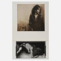 auf einem Sofa sitzende junge Frau und ein Blatt betitelt „Tätowierte liegend“, Radierungen auf Velin, jedes Blatt unter der Darstellung rechts in Blei signiert, ein Blatt datiert „(19)83“, jeweils eins von 100 Exemplaren, Darstellungsmaße max. ca. 24,5 x 27 cm, Blattmaße max. 39,5 x 48,5 cm. Künstlerinfo: auch Klaus Boettger, dt. Maler, Graphiker, Illustrator und Zeichner (1942 Dresden bis 1992 Wiesbaden), 1950-51 in Berlin und Aachen, ab 1951 in Wiesbaden, 1964-1969 Studium der Kunstgeschichte, Kunsterziehung, Philosophie und Biologie in Mainz, ab 1964 verstärkt Hinwendung zur Druckgraphik, ab 1969 vor allem als Radierer freischaffend, arbeitete für die Büchergilde Gutenberg, tätig in Wiesbaden, Quelle: AKL, Wikipedia und Internet.