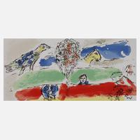 „Der grüne Strom“, für den Künstler typische Komposition aus Figur, Pferd und Vogel in Landschaft, Werksverzeichnis Mourlot 728, Farblithographie, 1974, mittig Faltlinie, Blattmaße ca. 28 x 56,5 cm, beigeben Werkmonographie von André Pieyre de Mandiargues und Expertise von Frank-Thomas Gaulin. Künstlerinfo: bürgerlich Moishe Zakharovich Shagalov, bedeutender russisch-frz. Maler, Graphiker und Bildhauer jüdischer Herkunft (1887 Liosno/Witebsk bis 1985 Paul de Vence), Schüler des Malers Jehuda Pen, 1907 an der Kaiserlichen Gesellschaft zur Förderung der Künste St. Petersburg, 1908 Privatschule Saidenberg und bei Léon Bakst an der Swansewa-Schule, ab 1910 eigenes Atelier in Paris, Pionier des Surrealismus, berühmt für seinen mystischen Symbolismus, tätig unter anderem in Petersburg, Paris, Montrouge, USA, Quelle: Vollmer, Wikipedia und Internet.