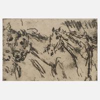 flüchtige Darstellung zweier eingespannter Pferde, Vernis mou, um 1920, unter der Darstellung in Blei rechts signiert „Lovis Corinth“ und links nummeriert „XXIV/XXV“, unter Passepartout und hinter Glas gerahmt, Darstellungsmaße ca. 9,7 x 14,6 cm. Künstlerinfo: eigentlich Franz Heinrich Louis Corinth, bedeutender dt. Maler, Lithograph und Radierer (1858 Tapiau/Ostpreußen bis 1925 Zandvoort), Studium an der Akademie Königsberg bei Otto Günther und ab 1880 an der Akademie München bei Franz von Defregger und Ludwig von Loefftz, beeinflusst von Wilhelm Trübner, als Radierer angelernt von Otto Eckmann, später in Paris und Bouguereau, neben Max Liebermann und Max Slevogt wichtigstes Mitglied der Berliner Sezession, 1918 Verleihung des Professorentitels durch die Berliner Akademie der Künste, 1921 Ehrendoktorwürde der Universität Königsberg, tätig in Berlin und Urfeld am Walchensee, Quellen: Thieme-Becker, Vollmer, Matrikel der Akademie München und Internet.