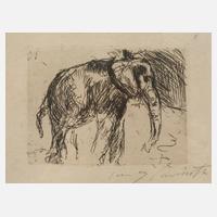 seitlicher Blick auf einen Elefanten, Werksverzeichnis Müller 445, Radierung mit dezentem Plattenton, 1917/18, rechts unten in Blei signiert „Lovis Corinth“, unter Passepartout und hinter Glas gerahmt, Darstellungsmaße ca. 8,3 x 11,2 cm. Künstlerinfo: eigentlich Franz Heinrich Louis Corinth, bedeutender dt. Maler, Lithograph und Radierer (1858 Tapiau/Ostpreußen bis 1925 Zandvoort), Studium an der Akademie Königsberg bei Otto Günther und ab 1880 an der Akademie München bei Franz von Defregger und Ludwig von Loefftz, beeinflusst von Wilhelm Trübner, als Radierer angelernt von Otto Eckmann, später in Paris und Bouguereau, neben Max Liebermann und Max Slevogt wichtigstes Mitglied der Berliner Sezession, 1918 Verleihung des Professorentitels durch die Berliner Akademie der Künste, 1921 Ehrendoktorwürde der Universität Königsberg, tätig in Berlin und Urfeld am Walchensee, Quellen: Thieme-Becker, Vollmer, Matrikel der Akademie München und Internet.