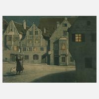 mittelalterliche Stadt im Mondschein, mit einigen erleuchteten Fenstern und Nachtwächter im Vordergrund, Farblithographie auf Karton, um 1910, im Stein signiert "Ernst Liebermann, Mchn" und bezeichnet "Druck von Hubert Köhler, Mchn", mittig unter der Darstellung betitelt "Kleinstadtidyll", minimale Erhaltungsmängel, rückseitig Spuren alter Montierung, Darstellungsmaße ca. 38,5 x 52,6 cm, Blattmaße ca. 42,5 x 54,5 cm. Künstlerinfo: dt. Maler, Graphiker und Illustrator (1869 Langemüß bis 1960 Beuerberg), Schüler der Kunstschule Nürnberg, anschließend an der Kunstgewerbeschule Berlin und 1890–93 Studium an der Berliner Akademie unter anderem bei Josef Scheurenberg, unternahm Studienreisen durch Deutschland, Italien und längerer Aufenthalt in Paris, zeitweilig Mitarbeiter der Münchner „Jugend“, beschickte die Ausstellungen des Glaspalast und 1937–44 die Großen Deutschen Kunstausstellungen im Haus der Deutschen Kunst München, 1944 Aufnahme in die "Gottbegnadeten-Liste", Mitglied im Münchner Verein Luitpoldgruppe, im Reichsverband Bildender Künstler Deutschlands, in der Allgemeinen Deutschen Kunstgenossenschaft, der Freien Künstlervereinigung Baden, dem Künstlerbund Bayern und Vorstand des Bundes zeichnender Künstler Münchens, tätig in Langemüß und ab 1897 in München-Gern, Quelle: Thieme-Becker, Dressler und Wikipedia.