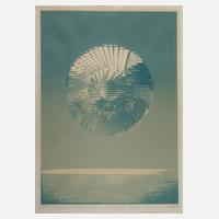 große flirrende Scheibe über stilisierter flacher Landschaft, Farbsiebdruck auf leichtem Karton, unter der Darstellung in Blei rechts signiert und datiert „Mack (19)72“ sowie links nummeriert „2/250“, geringe Erhaltungsmängel, Darstellungsmaße ca. 71,5 x 51,3 cm, Blattmaße 77,5 x 56 cm. Künstlerinfo: dt. Bildhauer, Maler und Graphiker (geboren 1931 Lollar), ab 1950 Studium an der Kunstakademie Düsseldorf, ab 1953 Studium der Philosophie an der Universität Köln, ab 1955 gemeinsames Atelier mit Otto Piene in Düsseldorf, 1957 zusammen mit Otto Piene Gründung der Gruppe ZERO, ab 1958 Entstehung erster „Rotoren“, 1961 tritt Günther Uecker der Gruppe ZERO bei, 1958, 1964 und 1977 Teilnahme an der documenta in Kassel, 1970 Teilnahme an der Biennale in Venedig, 1970 Berufung zum Professor in Osaka (Japan) und Mitglied der Akademie der Künste in Berlin, 1984 Brand seines Atelierhauses in Mönchengladbach, 2008 Gründung der ZERO foundation, 2015 Ernennung zum Ehrenmitglied der Kunstakademie Düsseldorf, Quelle: Wikipedia und Internet.