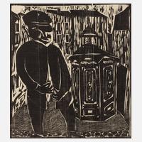 Herr neben einem Pissoir, Blatt aus der Graphikmappe „Rund um dem Chamissoplatz“, Holzschnitt, 1972, unter der Darstellung in Blei rechts signiert „Kurt Mühlenhaupt“ und links nummeriert „92/150“ sowie typographisch bezeichnet „Original-Holzschnitt“, Papier leicht gegilbt, unter Passepartout und hinter Glas gerahmt, Darstellungsmaße ca. 32 x 29 cm. Künstlerinfo: dt. Maler, Grafiker, Bildhauer und Schriftsteller (1921 Klein Ziescht bis 2006 Bergsdorf), Kindheit in Berlin-Tempelhof, ab 1935 Lehre als Modellbauer, später Fallschirmjäger im 2. Weltkrieg, Verletzung und Krankenhausaufenthalt, ab 1943 Kunststudium in Berlin, 1945 erneuter Kriegseinsatz und Verwundung, 1946–48 Studium an der Hochschule für Bildende Künste bei Maximilian Debus, 1948 Studienabbruch und als Tierzüchter sowie als Leierkastenmann in Berlin-Karow tätig, autodidaktische Weiterbildung als Künstler, 1956 Übersiedlung nach Marienfelde und 1958 nach Kreuzberg in West-Berlin, hier fortan als malender Trödler und Gastwirt tätig, unternimmt Studienreisen nach Paris, Südfrankreich, Spanien, Italien, Portugal, New York und Moskau, ab 1970 ausschließlich als Künstler freischaffend, gründete 1972 mit Günter Grass, Wolf-Dieter Schnurre, Wolfgang Schnell die Gruppe „Malerpoeten", beschickte zahlreiche Ausstellungen im In- und Ausland, zeitweise tätig in Berlin-Kladow, Sommeraufenthalte im Tal Montes de Cima in der Algarve, 1992–99 Ausbau des Gutshofes in Bergsdorf bei Zehdenick zum Wohnhaus mit Atelier und Galerie, Quelle: Eisold "Künstler in der DDR", Wikipedia und Internet.
