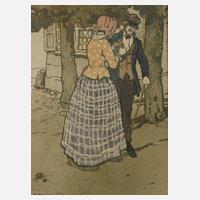 junge Frau, ihrem Mann eine Blume an das Revers steckend, Farblithographie, links unten im Stein signiert und datiert „A. Niemeyer 1903“, hinter Glas gerahmt, Falzmaße ca. 40 x 31 cm. Künstlerinfo: eigentlich Adelbert Hans Gustav Niemeyer, dt. Maler, Architekt und Kunstgewerbler (1867 Warburg bis 1932 München), 1884–88 Studium an der Düsseldorfer Kunstakademie, im Anschluss an einer privaten Kunstschule in München und an der Académie Julian in Paris, 1904 große Goldene Medaillie auf der Weltausstellung in St. Louis, ab 1907 Professor an der Kunstgewerbeschule in München, 1907 Mitbegründer des Deutschen Werkbundes und der Deutschen Werkstätten für Handwerkskunst in Dresden und München, war auch tätig für die Porzellanmanufakturen Meissen und Nymphenburg sowie für Villeroy & Boch, Reinhold Merkelbach und die Karlsruher Majolika-Manufaktur, 1925 Gestaltung des Festzuges zur Eröffnung des Deutschen Museums, Quelle: Thieme-Becker, Vollmer und Wikipedia.