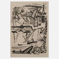Blick aus der Vogelschau über ein Hafenbecken und im Hintergrund Windmühle mit Leuchtturm, Lithographie, um 1910–20, im Stein ligiertes Monogramm „HMP“, etwas lichtrandig, unter Passepartout und hinter Glas gerahmt, Darstellungsmaße ca. 24 x 17,5 cm. Künstlerinfo: eigentlich Hermann Max Pechstein, dt. Maler, Graphiker, Bildhauer und Kunstgewerbler (1881 Zwickau bis 1955 Berlin), 1896–1900 Dekorationsmalerlehre in Zwickau, anschließend Studium an der Staatlichen Kunstgewerbeschule und ab 1902 Meisterschüler von Otto Gussmann, ab 1903 Weiterbildung an der Akademie in Dresden, 1906 Begegnung mit Erich Heckel und Ernst-Ludwig Kirchner, fortan Mitglied der Künstlervereinigung „Brücke“, 1907 mit Sächsischem Staatspreis Italienaufenthalt und 1907/08 in Paris, ab 1908 in Berlin, 1908 Mitglied der Berliner „Secession“ und 1910 Mitglied der „Neuen Secession“, was 1912 zum Ausschluss aus der „Brücke“ führte, ab 1909 regelmäßige Aufenthalte in Nidden (Ostpreußen) und in Italien, unternahm zahlreiche Studienreisen, unter anderem zu den Palau-Inseln und nach Südfrankreich, 1918 Mitbegründer der „Novembergruppe“, ab 1923 Professor und Mitglied der Preußischen Akademie der Künste, 1933 als „entartet“ entlassen und mit Malverbot belegt, 1937 Ausschluss aus der Akademie, 1944 Verlust eines Großteils seines Lebenswerkes durch Kriegseinwirkungen, 1945 erneut Professor an der Hochschule der Bildenden Künste (HBK) Berlin, Quelle: Thieme-Becker, Vollmer, Dressler, Wikipedia, Schülerlisten der Dresdner Akademie, Akten der Reichskammer der Bildenden Künste Berlin und Internet.