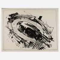 dynamische Komposition, in der Darstellung signiert „Sonderborg“ und datiert „12. VI. (19)63“ sowie unter der Darstellung in Blei „Sonderborg“ weiterhin in Blei nummeriert „18/25“, leichte Erhaltungsmängel im Randbereich, Darstellungsmaße ca. 49,5 x 62,5 cm, Blattmaße ca. 56 x 75,5 cm. Künstlerinfo: eigentl. Kurt Rudolf Hoffmann, Maler und Graphiker des Informel (1923 Sonderborg/Dänemark bis 2008 Hamburg), Kindheit in Hamburg, kam als 18-jähriger in Gestapohaft und in das Konzentrationslager Fuhlsbüttel, Lehre als Kaufmann, ging als Einkaufsassistent einer Exportfirma aus Hamburg in die Sowjetunion, Privatunterricht bei dem Maler Ewald Becker-Carus, Studium an der Landeskunstschule Hamburg bei Willem Grimm und Maria May, Teilnahme an der documenta II und III in Kassel, 1953 Anschluss an die Künstlergruppe ZEN 49, öfter wechselnde Wohnsitze, Quelle: Wikipedia.