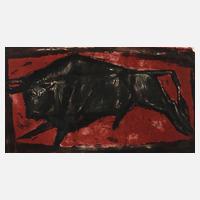 rennender Stier vor rotem Grund, Farblithographie, rechts unten in Blei signiert und datiert „Kurt Steinel (19)68“, links unten Nummer in Blei „479 K 67/80“, geringe Altersspuren, unter Passepartout freigestellt und hinter Glas gerahmt, Darstellungsmaße ca. 30,5 x 52 cm. Künstlerinfo: dt. Zeichner, Graphiker und Illustrator (1929 Freiburg im Breisgau bis 2005 Offenbach am Main), 1949–52 Studium an der Akademie der Bildenden Künste in Freiburg bei Heinrich Wittmer, Gottfried Meyer und Rudolf Dischinger, anschließend Studium in Offenbach, ab 1958 Leiter einer Fachklasse, 1971 Ernennung zum Professor, 1974–98 Rektor der Hochschule für Gestaltung in Offenbach am Main, Quelle: Wikipedia.
