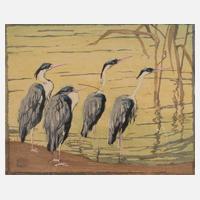 vier Fischreiher (Graureiher) am Ufer eines Teichs stehend, Farbholzschnitt, Anfang 20. Jh., unter der Darstellung in Blei rechts signiert „Hel. Tüpke-Grande“ sowie links bezeichnet und teils unleserlich betitelt „Handdruck … Fischreiher“, im Stock monogrammiert, leichte Altersspuren, unter Passepartout und hinter Glas gerahmt, Darstellungsmaße ca. 24,5 x 30 cm. Künstlerinfo: poln. Malerin und Graphikerin (1871 Reudchen bis 1946 Breslau), Quelle: Internet.