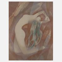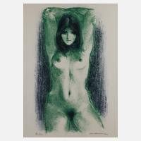 Damenakt mit hinter dem Kopf verschränkten Armen, Farblithographie, um 1970, unter der Darstellung in Blei rechts signiert „Medard Varsanyi“ und links nummeriert „42/125“, unter Passepartout und hinter Glas gerahmt, Darstellungsmaße ca. 54 x 32 cm. Künstlerinfo: ungarischer Grafiker (geb. 1913 in Leva/Ungarn), Studium in Budapest, war tätig in Amerika und Deutschland, Quelle: Internet.