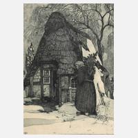 ältere Frau kommt mit einem Tannenbaum an ihrer mit Reet gedeckten Hütte an, währenddessen ihre Kinder sie schon gespannt erwarten, Werksverzeichnis Rief 48, Radierung in Dunkelblau, 1912, unter der Darstellung rechts in Blei signiert „H Vogeler“, links unten in der Platte monogrammiert „HVW“, Papier gebräunt, kleiner Einriss und rückseitig Reste alter Montierung, Darstellungsmaße ca. 37,5 x 28 cm, Blattmaße ca. 46 x 35 cm. Künstlerinfo: auch „Heinrich Johann Vogeler-Worpswede”, bedeutender dt. Maler, Graphiker, Illustrator und Designer (1872 Bremen bis 1942 bei Kornejewka in Kasachstan), studierte 1890–94 an der Akademie Düsseldorf bei Peter Johann Theodor Janssen, Eugen und Arthur Kampf, Mitglied der studentischen Malerverbindung “Tartarus”, Studium zeitweise unterbrochen durch Reisen nach Holland, Brügge, Genua, Rapallo und Paris, 1894 Anschluss an die Künstlervereinigung Worpswede, Radierschüler bei Hans am Ende, 1895 Erfolg der Künstlergruppe auf Gemeinschaftsausstellung im Münchner Glaspalast, 1907 Mitbegründer des Deutschen Werkbundes, 1908 Gründung der Worpsweder Werkstätte, 1931 Emigration in die Sowjetunion, erhielt zahlreiche Ehrungen, Mitglied im Reichsverband Bildender Künstler Deutschlands und in der Vereinigung Nordwestdeutscher Künstler, tätig unter anderem in Worpswede, 1927–31 Berlin-Britz und Moskau, Quelle: Internet, Thieme-Becker, Vollmer, Goldstein und Dressler.