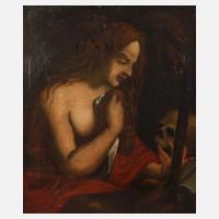Darstellung der spärlich bekleideten Jüngerin Jesu in ihrer Einsiedelei mit Buch, Schädel und Kruzifix im diffusen Licht, lasierende barocke Genremalerei, Öl auf Leinwand, um 1700, unsigniert, doubliert, alt retuschiert, restaurierungsbedürftig, in Berliner Leiste (bestoßen) gerahmt, Falzmaße ca. 77 x 65,5 cm.