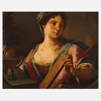 Brustbildnis einer freizügig in barocker Mode gekleideten Dame, in der linken Hand hält die junge Frau einen Himmelsglobus und in der rechten Hand ein weiteres hölzernes Instrument, welches auf Grund des fragmentarischen Charakters des Gemäldes nicht zuordenbar ist, am oberen Ende dieses Instruments ist ein Hexagramm (auch "Siegel Salomons" genannt) angebracht, was nach dem Verständnis des Barock das Sinnbild der Quintessenz ist und den sagenhaften "Stein der Weisen" darstellt, somit kann die Dargestellte als Allegorie der Wissenschaften im Allgemeinen, als auch der Astrologie bzw. der Astronomie im Besonderen gedeutet werden, lasierende barocke Genremalerei, Öl auf Leinwand, 1. Hälfte 18. Jh., unsigniert, Craquelure, auf Hartfaserplatte aufgezogen, retuschiert, restaurierungsbedürftig, gerahmt, Falzmaße ca. 53 x 63,5 cm.