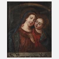 Jesus mit seiner Mutter Maria im Typus Eleusa in inniger Zugewandtheit, die ungewöhnliche Darstellung zeigt das ebenfalls im roten Wams gekleidete Jesuskind unterm blauen Mantel seiner Mutter, über beider Köpfen mit Nimbus ist vor dunklem Grund ein gespiegelter Regenbogen erkennbar, dieser steht als "Auge Gottes" für die Allgegenwart des sehenden Gottes, die Regenbogenfarben wiederum symbolisieren die Heiligkeit der Dargestellten und den alttestamentarischen "Neuen Bund" Gottes mit den Menschen, unter der Darstellung Schriftband "H. Maria von gutem Rath.", die Verehrung Mariens als "Mutter vom guten Rat [lat.: Mater boni consilii]" wurde vor allem vom Augustinerorden betrieben und spätestens durch Papst Leo XIII. in die Lauretanische Litanei aufgenommen, gering pastose, religiöse Genremalerei, Öl auf grober Leinwand, 18. Jh., unsigniert, Craquelure, Farbplatzer, reinigungsbedürftig, etwas restaurierungsbedürftig, gerahmt, Falzmaße ca. 51,5 x 4,5 cm.