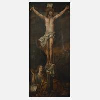 Darstellung des gekreuzigten Jesus Christus in der Todesstunde, mit der Trauernden Maria Magdalena zu seinen Füßen, vor der imaginären Kulisse von Jerusalem, am Fuße des Kreuzes sind diverse Gegenstände gruppiert, so kennzeichnen die gekreuzten Knochen am Kreuz, als auch der Totenschädel, den Ort als Hinrichtungsstätte "Golgota [dt. "Ort des Schädels"]", gleichwohl der Schädel mit der Salbbüchse auch auf Maria Magdalena als deren Attribute verweisen, links unten symbolisiert ein Apfel und eine Schlange den Sündenfall der Menschheit, der in der Kreuzigung des Gottessohnes seinen dramatischen Höhepunkt fand, Maria Magdalenas Oberkörper lagert auf einer Papierrolle, auf der undeutlich lesbar ist "Marc Cap. ... Vers 35.", diese Worte deuten auf das Markusevangelium Kapitel 15, welches vom Martyrium Jesu berichtet und im Vers 35 schreibt "Einige von denen, die dabeistanden und es hörten, sagten: Hört, er ruft nach Elija!", lasierende, teils pastose religiöse Genremalerei, Öl auf Papier, 18. Jh., sekundär auf Sperrholz aufgezogen, unsigniert, alte Reparaturen, Erhaltungsmängel, restaurierungsbedürftig, gerahmt, Falzmaße ca. 150 x 70 cm.