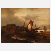 anlandende Fischer am steinigen Strand mit Bauernhäusern in der Morgendämmerung, lasierende, teils gering pastose Genremalerei im gedeckten Atelierton, Öl auf Leinwand, wohl 18. Jh., unten mittig undeutlich signiert "Wuger" oder "Wüger", Craquelure, Keilrahmen etwas durchzeichnend, hinterlegte Fehlstellen in der Leinwand, restauriert, etwas restaurierungsbedürftig, gerahmt, Falzmaße ca. 74 x 99,5 cm.