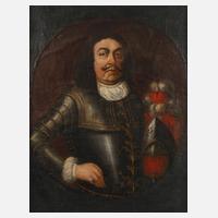 Portrait eines Herren mittleren Alters in Ritterrüstung, mit Helm zu seiner Seite, teils pastose Portraitmalerei, Öl auf Leinwand und auf Leinwand doubliert, wohl 17. Jh., starkes Craquelure, gerahmt, Falzmaße ca. 97 x 76 cm.