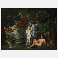 Parklandschaft mit Wasserfall und einem Engel, welcher eine nackte junge Frau zu einem unbekleideten jungen Mann führt, Öl auf Holztafel, um 1780, Craquelure, Tafel zweifach gerissen, gerahmt, Falzmaße ca. 32,5 x 40,5 cm.