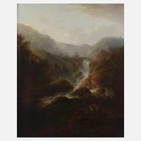 Wanderer in imposanter sommerlicher Gebirgslandschaft, mit zwischen mächtigen Felsen hindurch stürzendem Gebirgsbach mit Wasserfall, vor steinerner Brücke, lasierende Landschaftsmalerei, Öl auf Leinwand, 18. Jh., unsigniert, Craquelure, hinterlegte Fehlstelle in der Leinwand, alt restauriert, Keilrahmen und originaler Rahmen holzwurmstichig, Falzmaße ca. 73 x 62 cm.