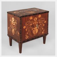 1920er Jahre, mahagonifurniert, allseitig feine Einlegearbeiten in verschiedenen Edelhölzern, Blütenbuketts in Amphorenvase, normale Altersspuren, mit Schlüssel, Maße 56 x 56 x 30 cm.