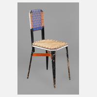 Frankreich, 1920er Jahre, Buchenholz schwarz und orange gefasst, die Zarge und Lehne mit umlaufendem Band aus Aluminium, Verstrebungen der Beine sichtbar verschraubt, Geflecht der Lehne aus farbig gefasstem Pettigrohr, Geflecht der Sitzfläche fehlt, Altersspuren, H 86 cm, SH 47 cm.
