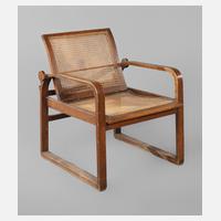 um 1930, Eiche massiv, Sitzfläche und Lehne mit originalem Geflecht, Lattengestell mit Bodenkufe, die Lehne in drei Stufen verstellbar, guter unrestaurierter Originalzustand, Maße 78 x 65 x 68 cm.